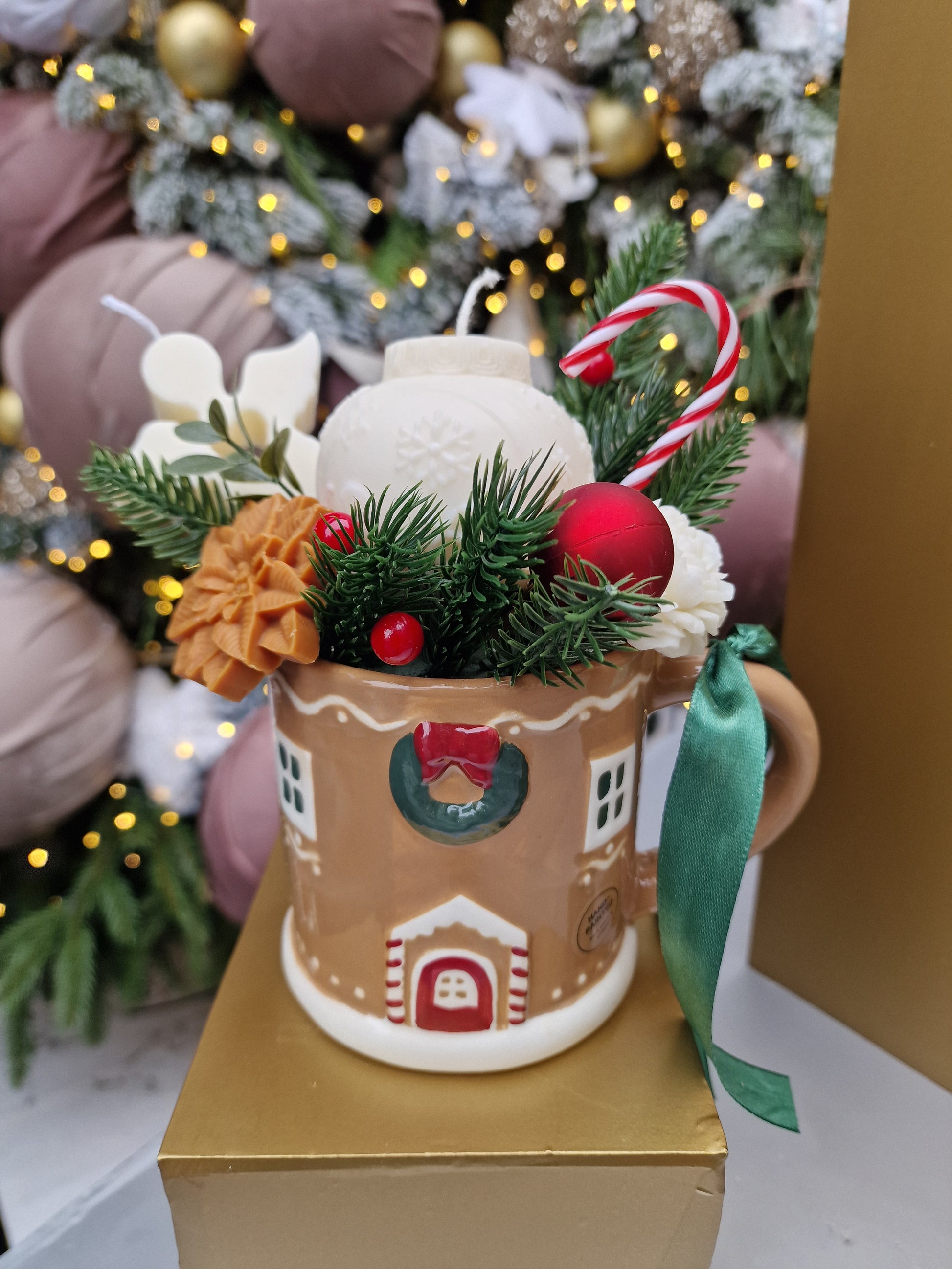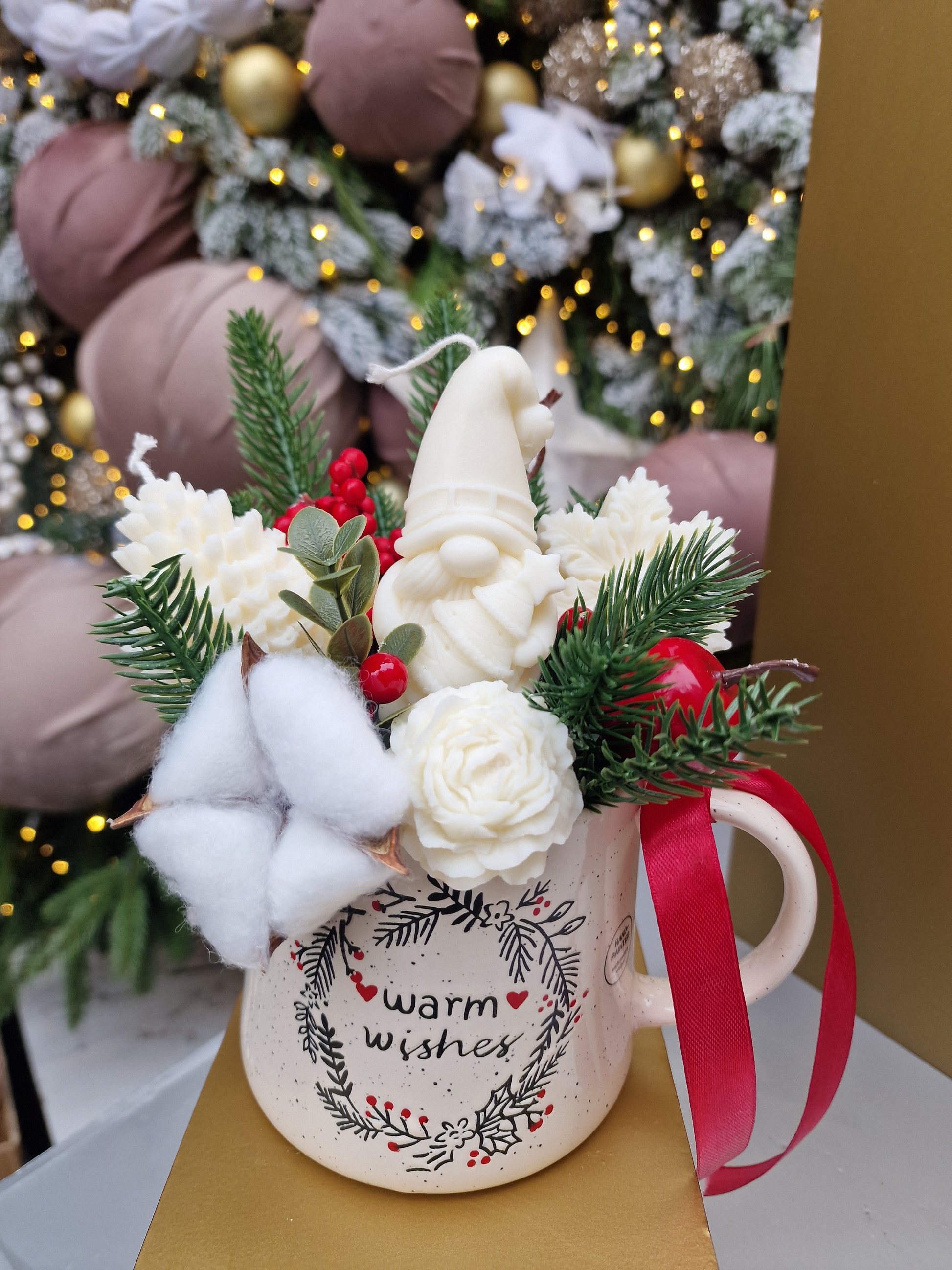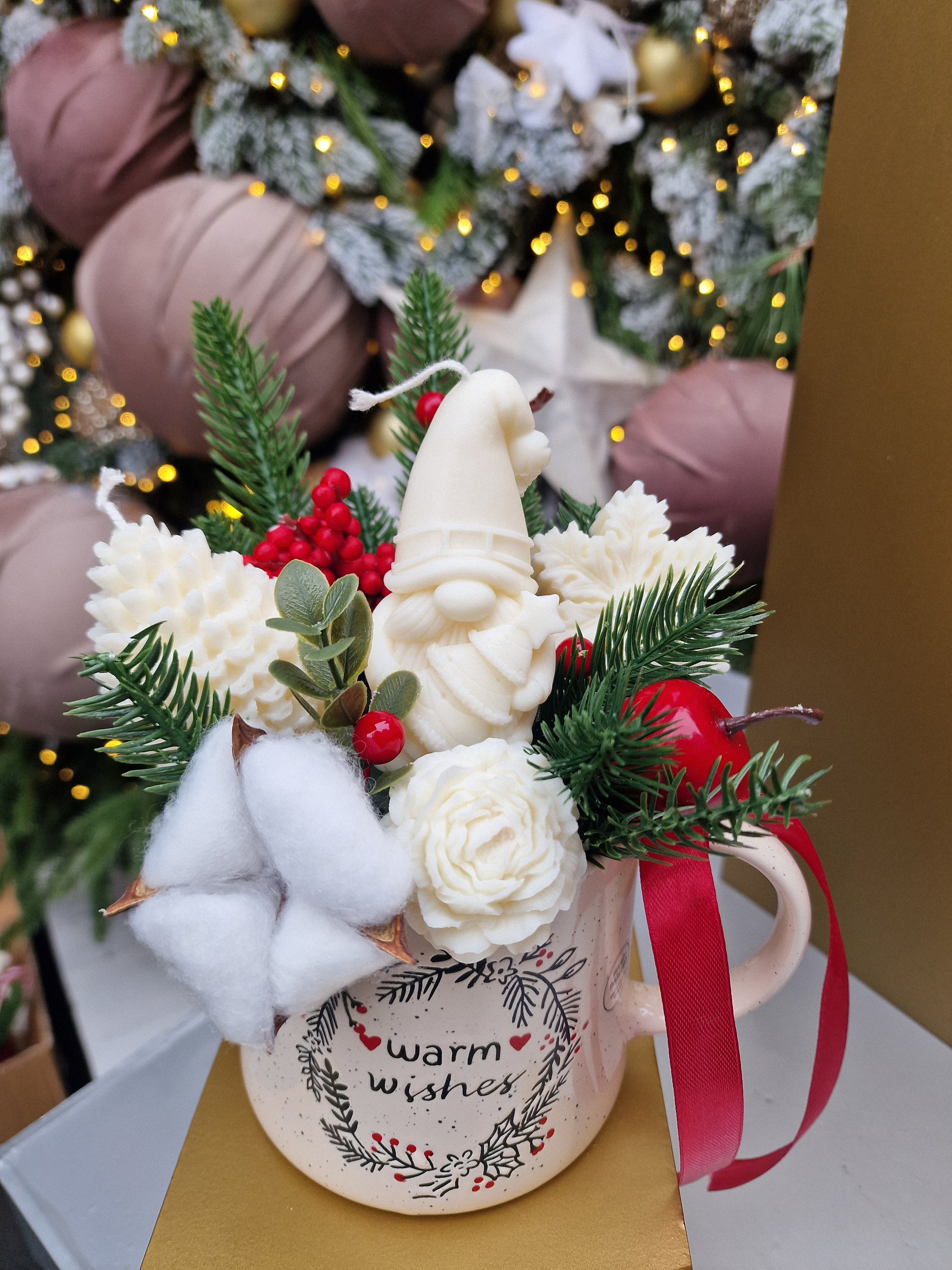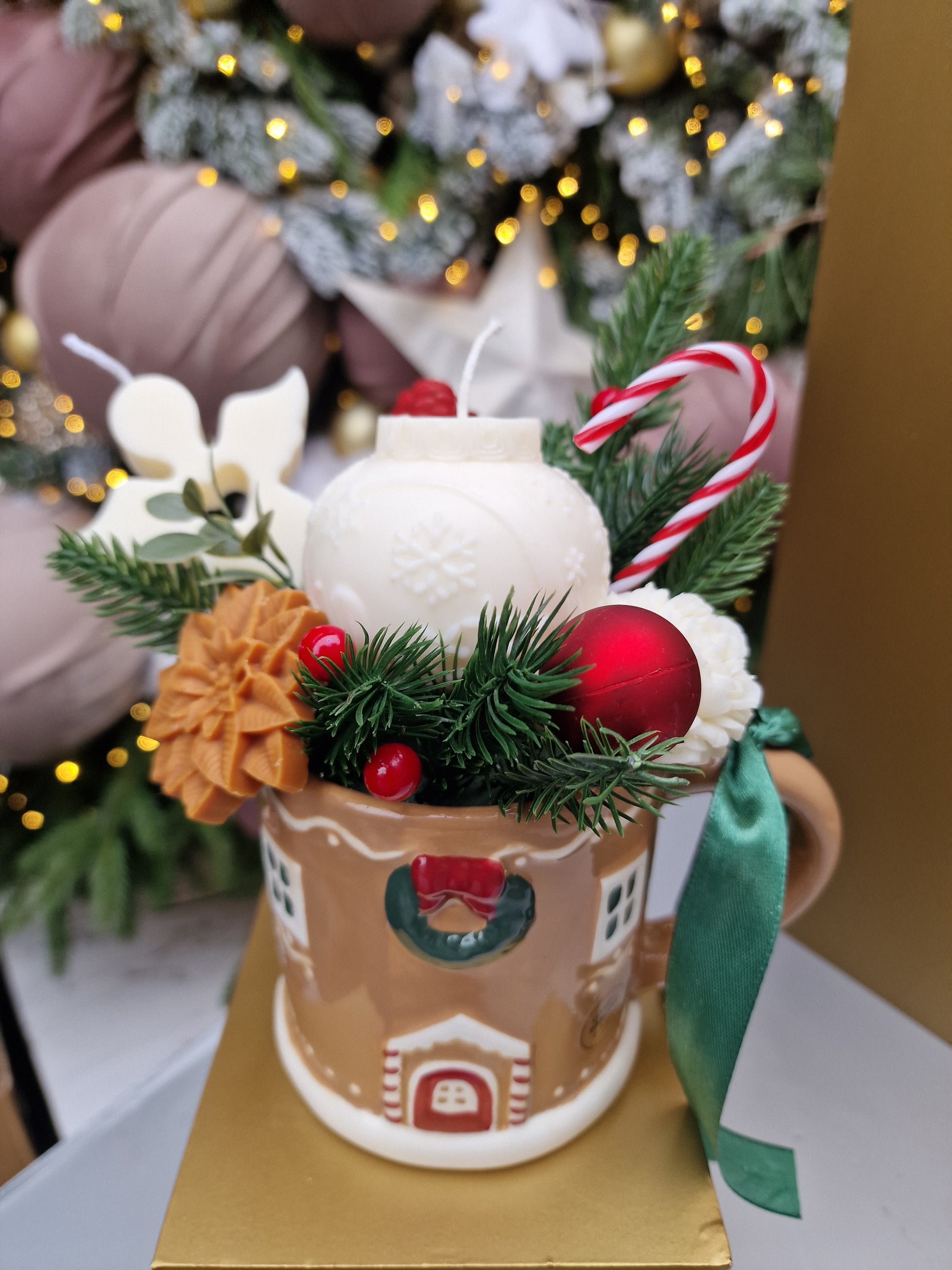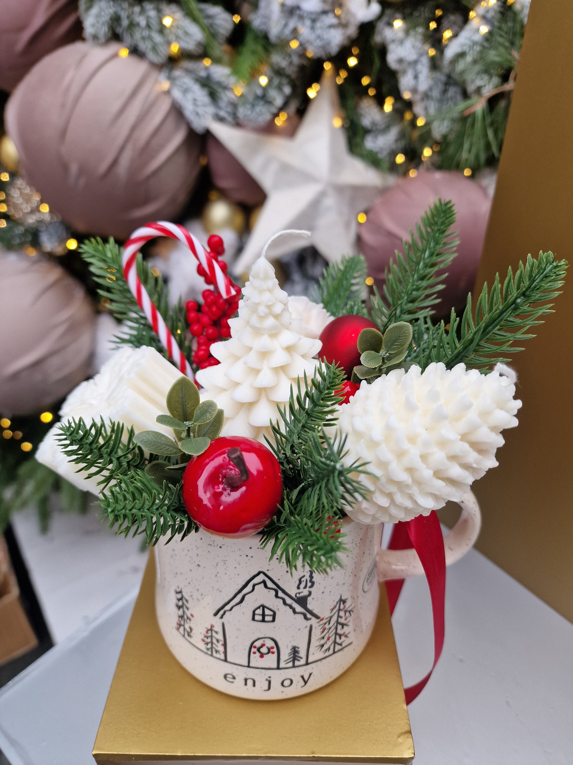 Cană festivă din lumânări - inspirată de bucuria simplă a iernii și strălucirea liniștită a Crăciunului. O idee de cadou unică, care nu numai că încântă ochiul pentru o perioadă lungă de timp, dar adaugă și o atmosferă unică oricărui interior. Cănițele noastre conțin flori delicate sculpatate manual, veșnice, care nu se vor ofili niciodată – care ulterior pot fi folosite si separat ca lumânări, iar cănile pentru un ceai cald lângă brad.