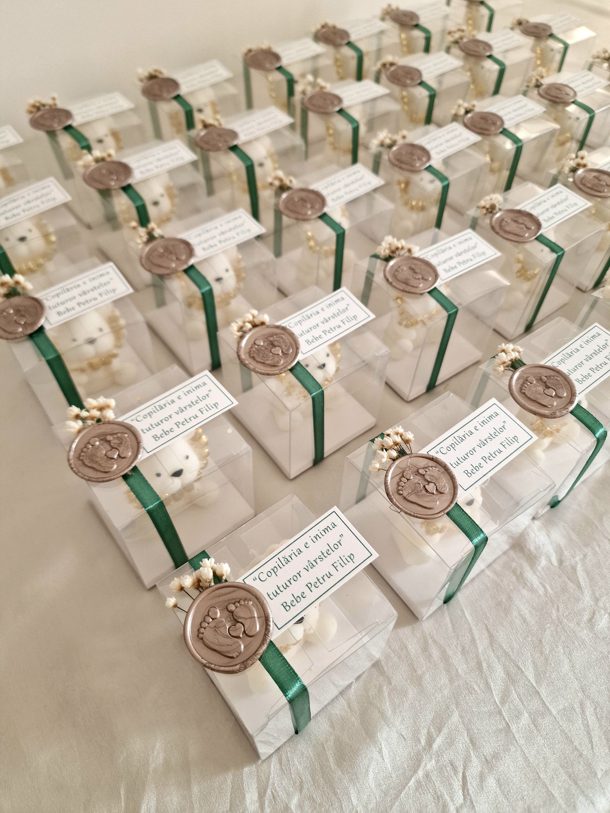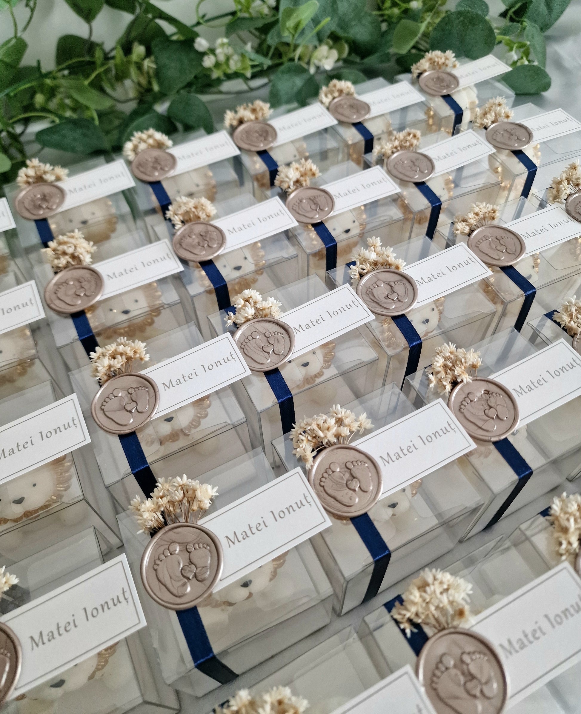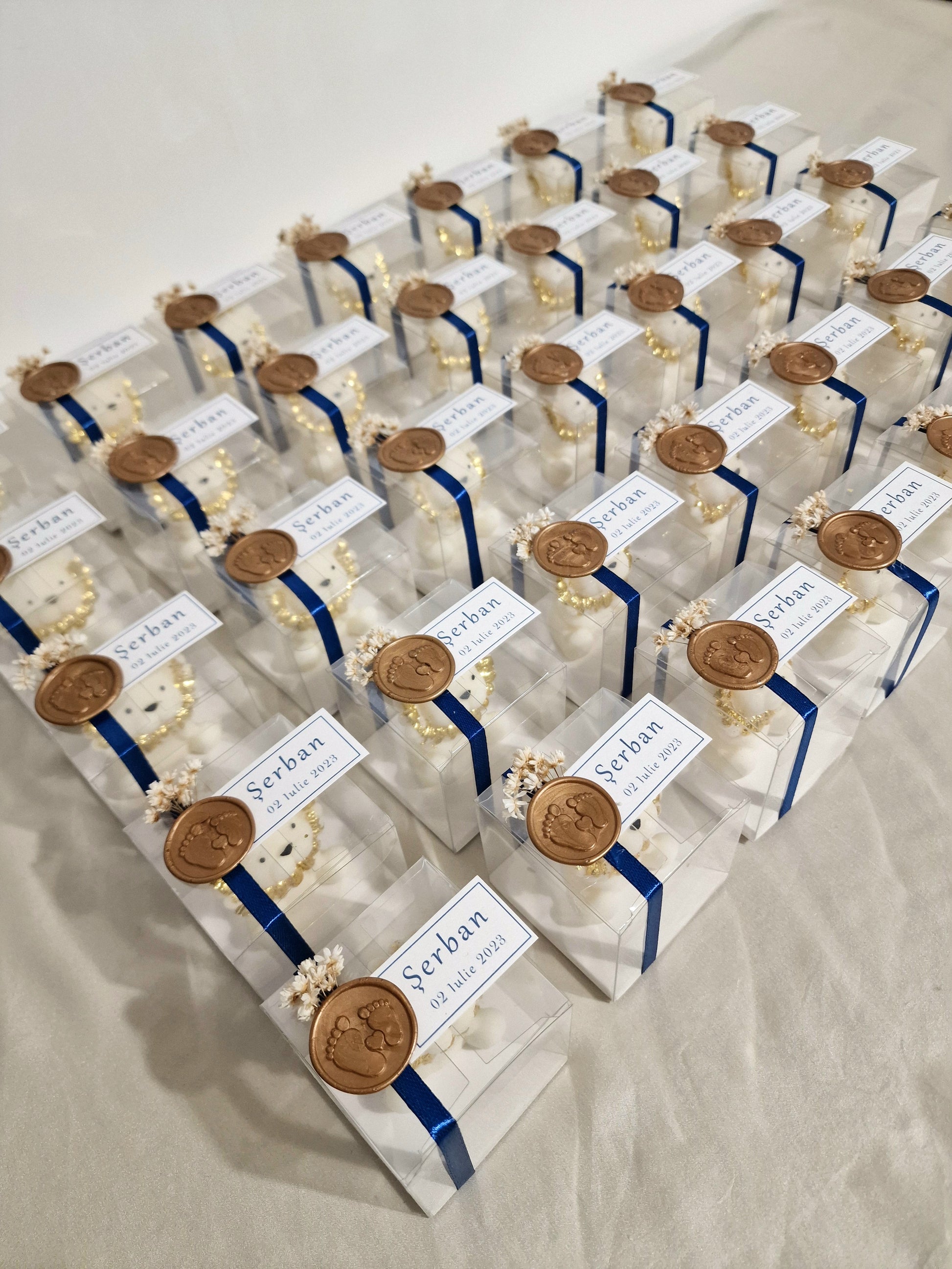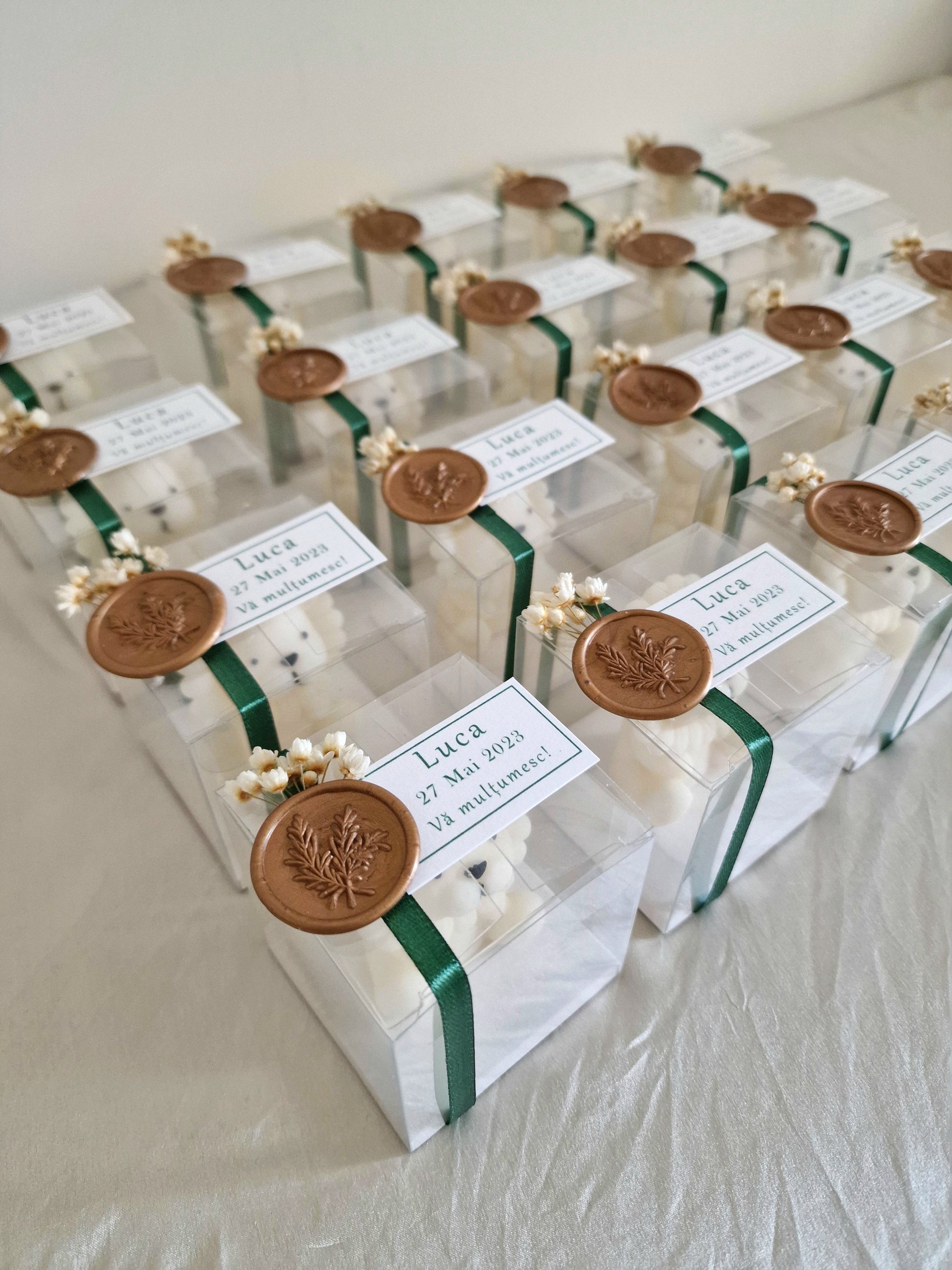 Vă rugăm să specificați finisajele de ambalare preferate (panglici, note de mulțumire, buchețe de flori etc) în rubrica specială de personalizare! După plasarea comenzii, veți fi contactată pentru a discuta în detaliu opțiunile de personalizare ale mărturiilor, astfel încât rezultatul final să reflecte perfect dorințele dumneavoastră.