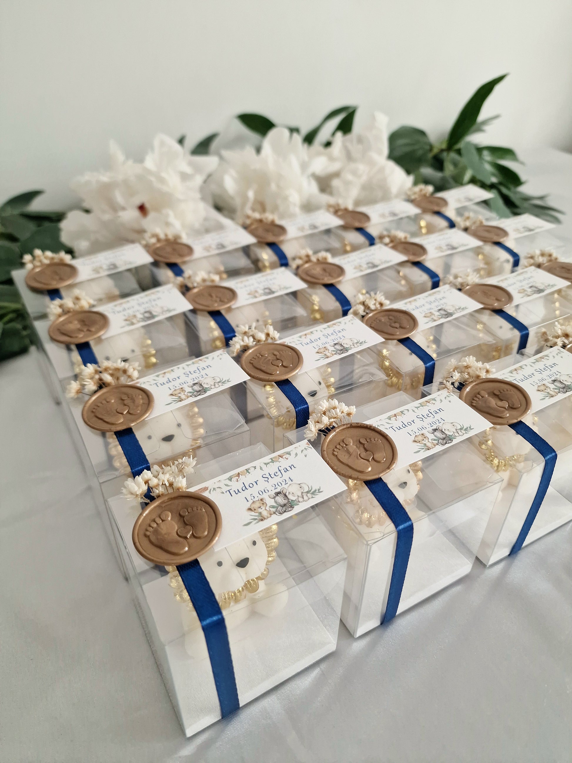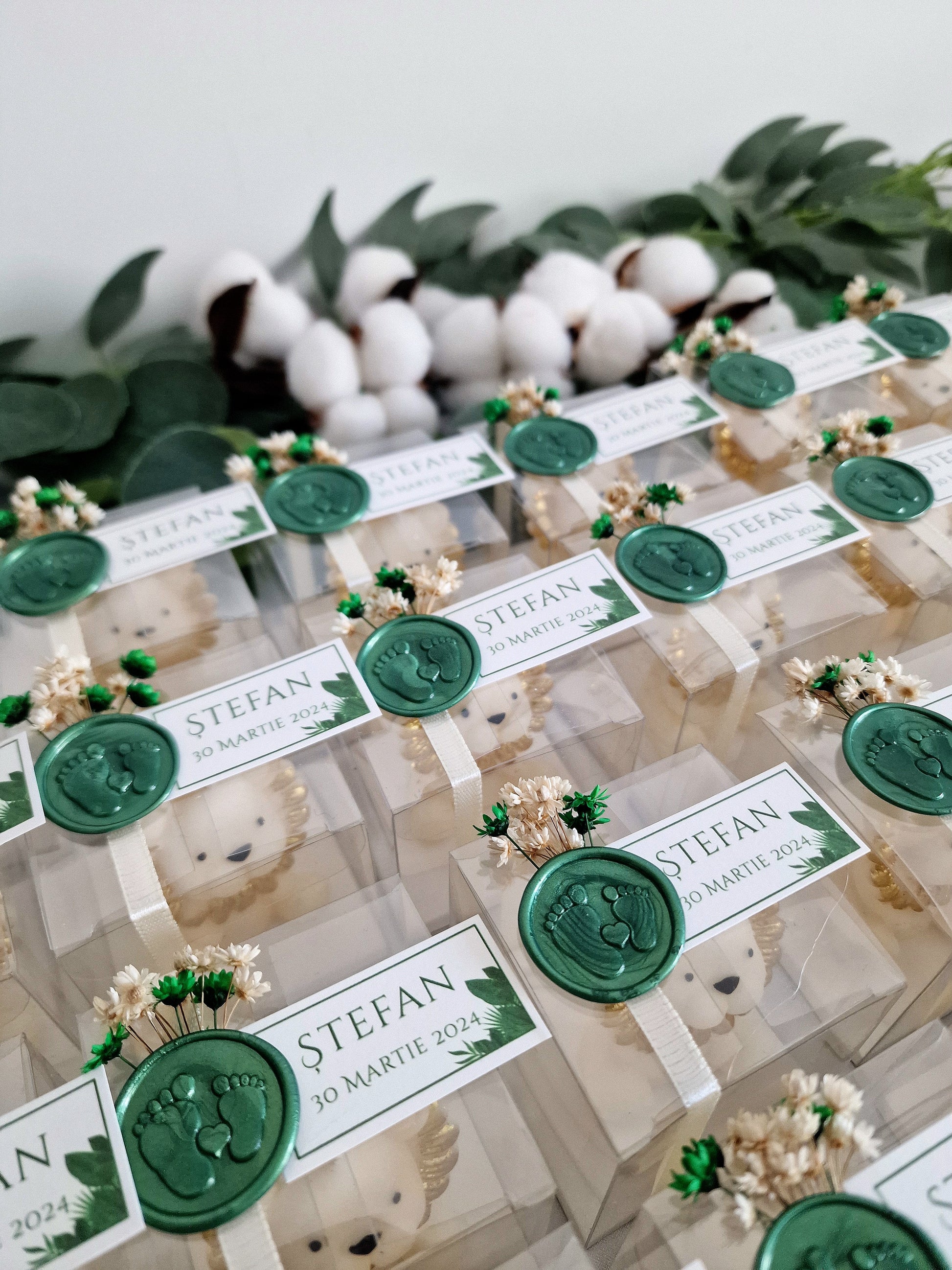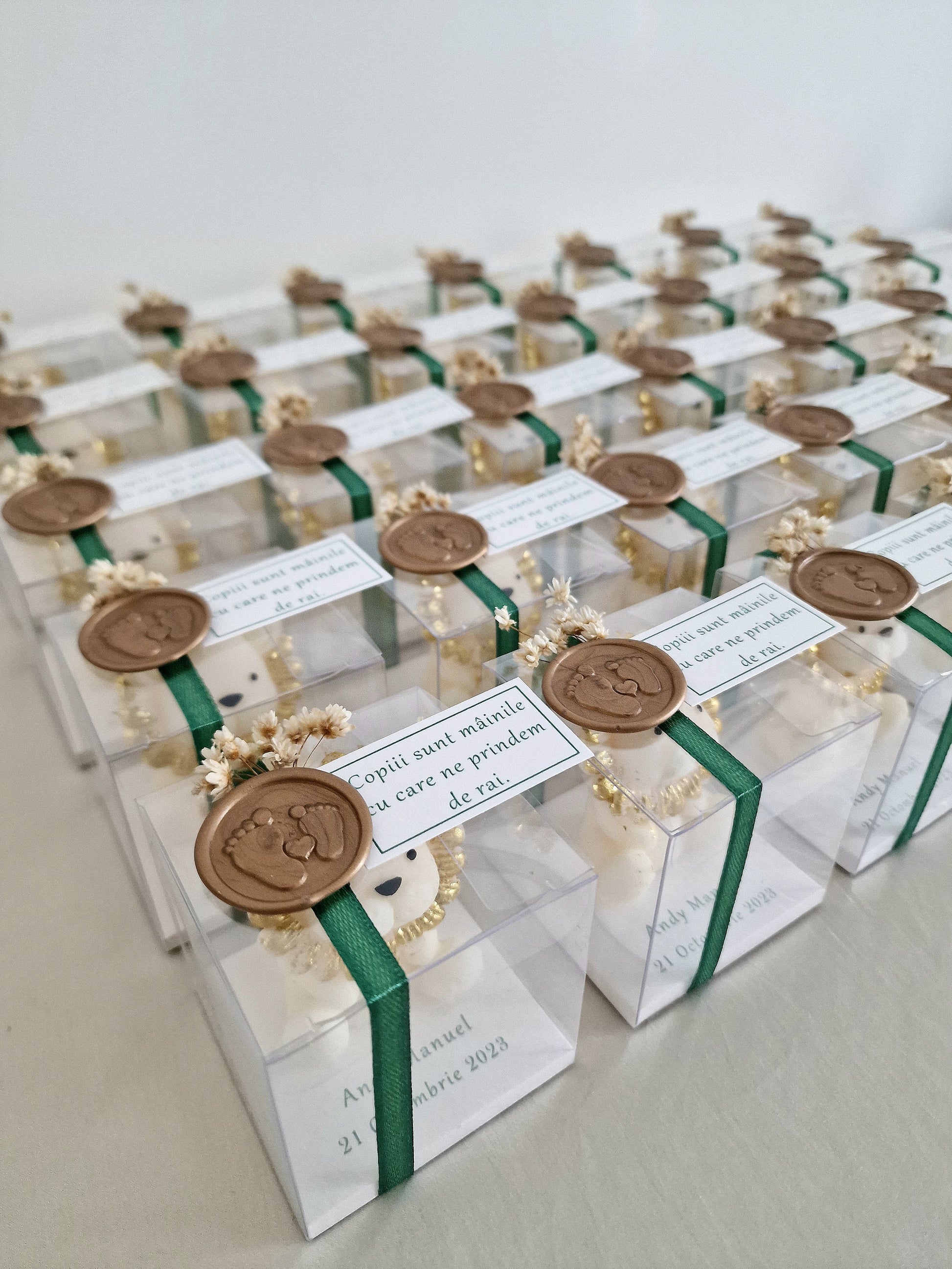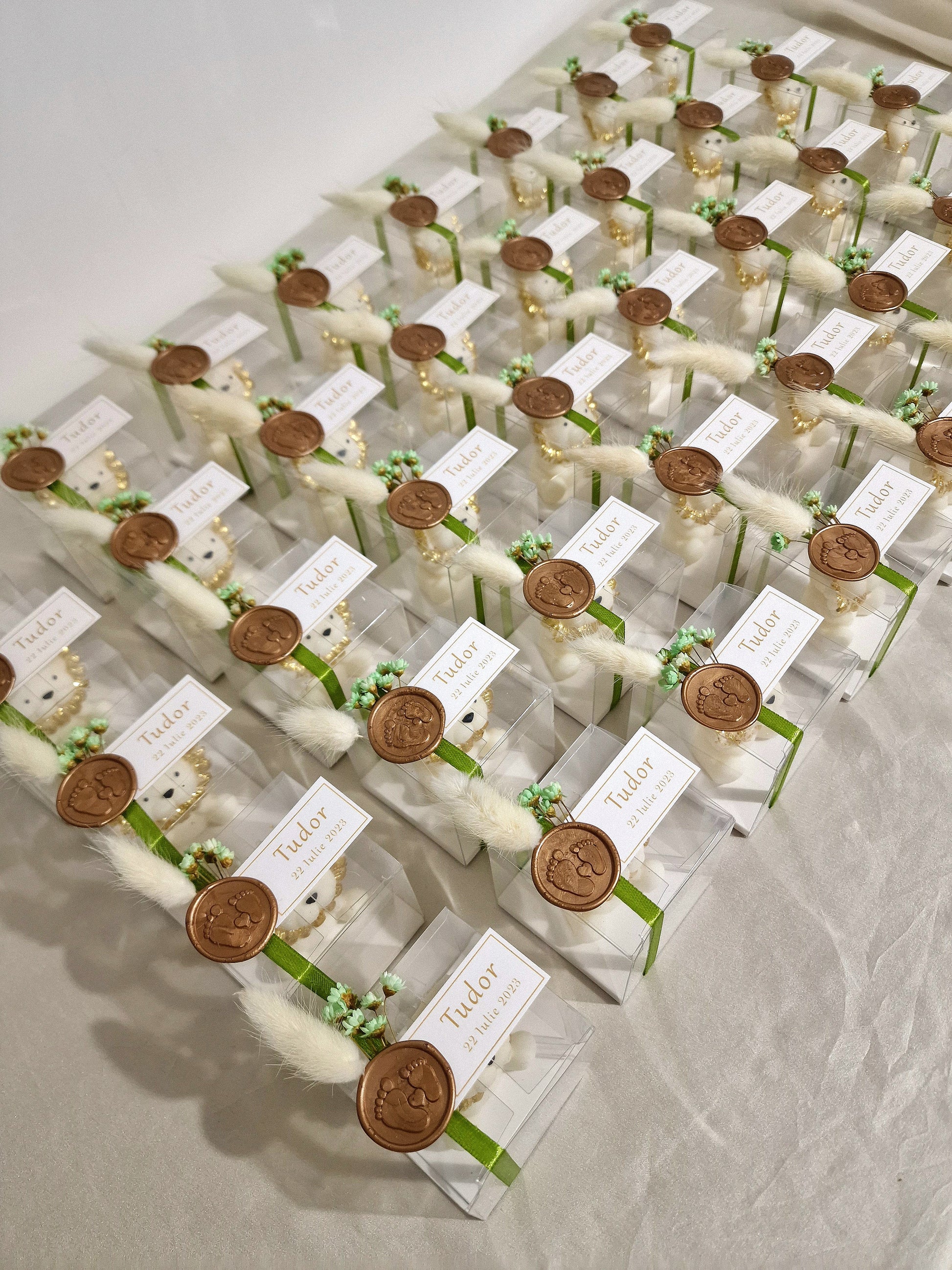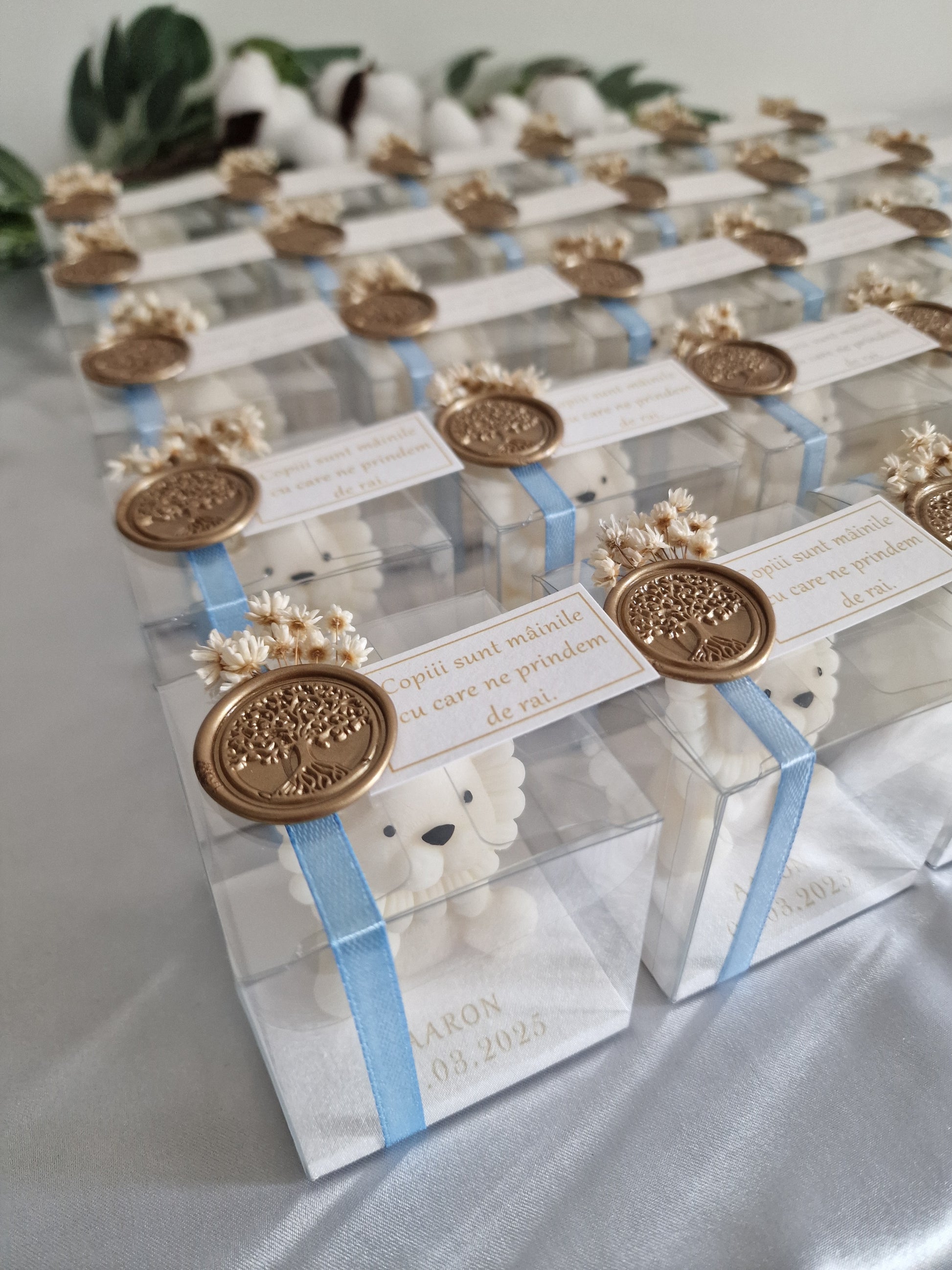 Vă rugăm să specificați finisajele de ambalare preferate (panglici, note de mulțumire, buchețe de flori etc) în rubrica specială de personalizare! După plasarea comenzii, veți fi contactată pentru a discuta în detaliu opțiunile de personalizare ale mărturiilor, astfel încât rezultatul final să reflecte perfect dorințele dumneavoastră.
