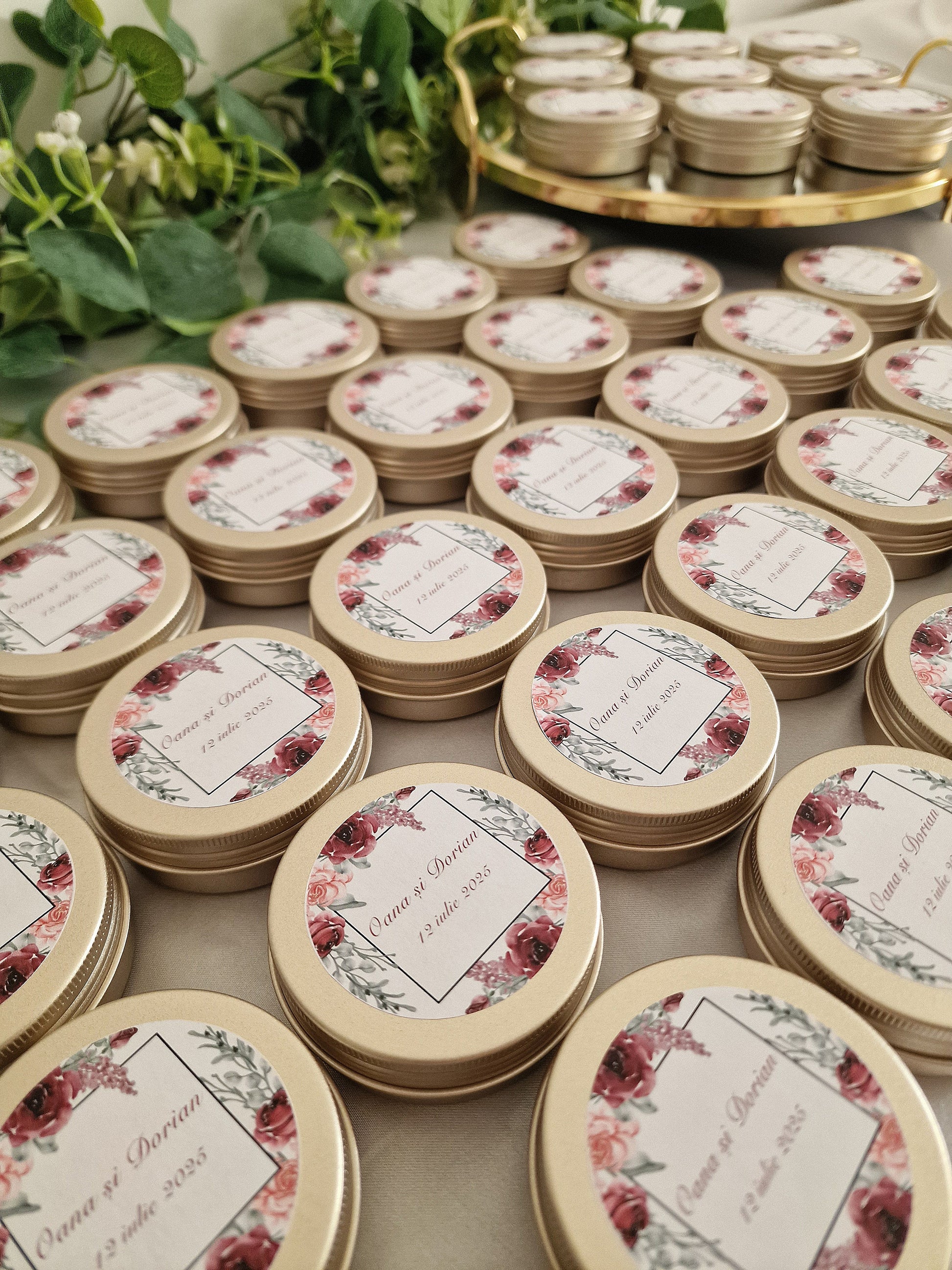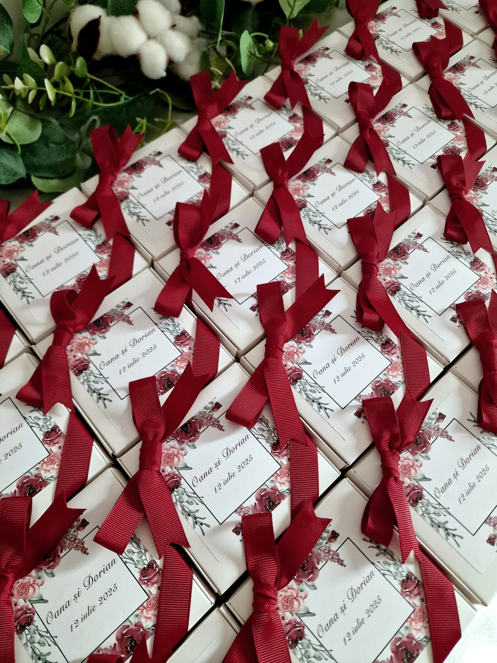 Vă rugăm să specificați finisajele de ambalare preferate (panglici, note de mulțumire, buchețe de flori, sigiliu etc) în rubrica specială de personalizare! După plasarea comenzii, veți fi contactată pentru a discuta în detaliu opțiunile de personalizare ale mărturiilor, astfel încât rezultatul final să reflecte perfect dorințele dumneavoastră.