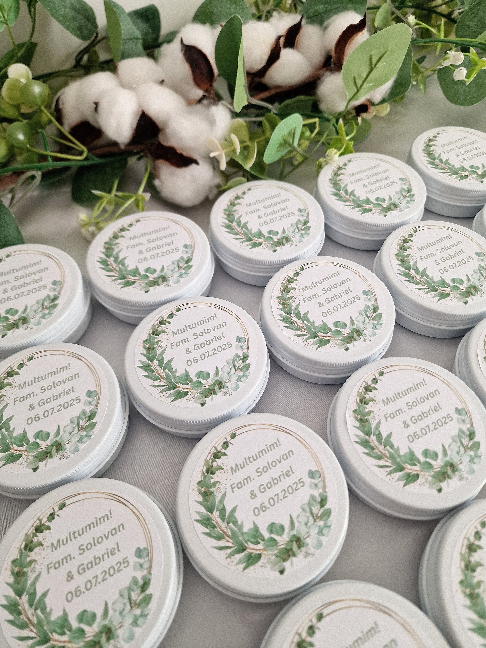 Recipientele se pot achiziționa simple, fără ambalaj sau în cutiuță albă finisată cu etichetă si panglică. Toate recipientele au eticheta inclusă.