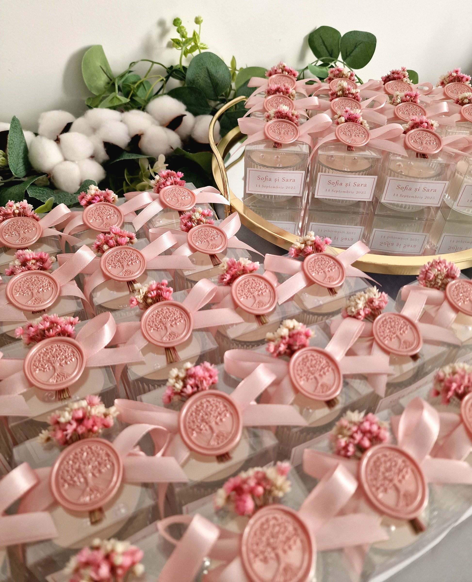 Vă rugăm să specificați finisajele de ambalare preferate (panglici, note de mulțumire, buchețe de flori etc) în rubrica specială de personalizare! După plasarea comenzii, veți fi contactată pentru a discuta în detaliu opțiunile de personalizare ale mărturiilor, astfel încât rezultatul final să reflecte perfect dorințele dumneavoastră.