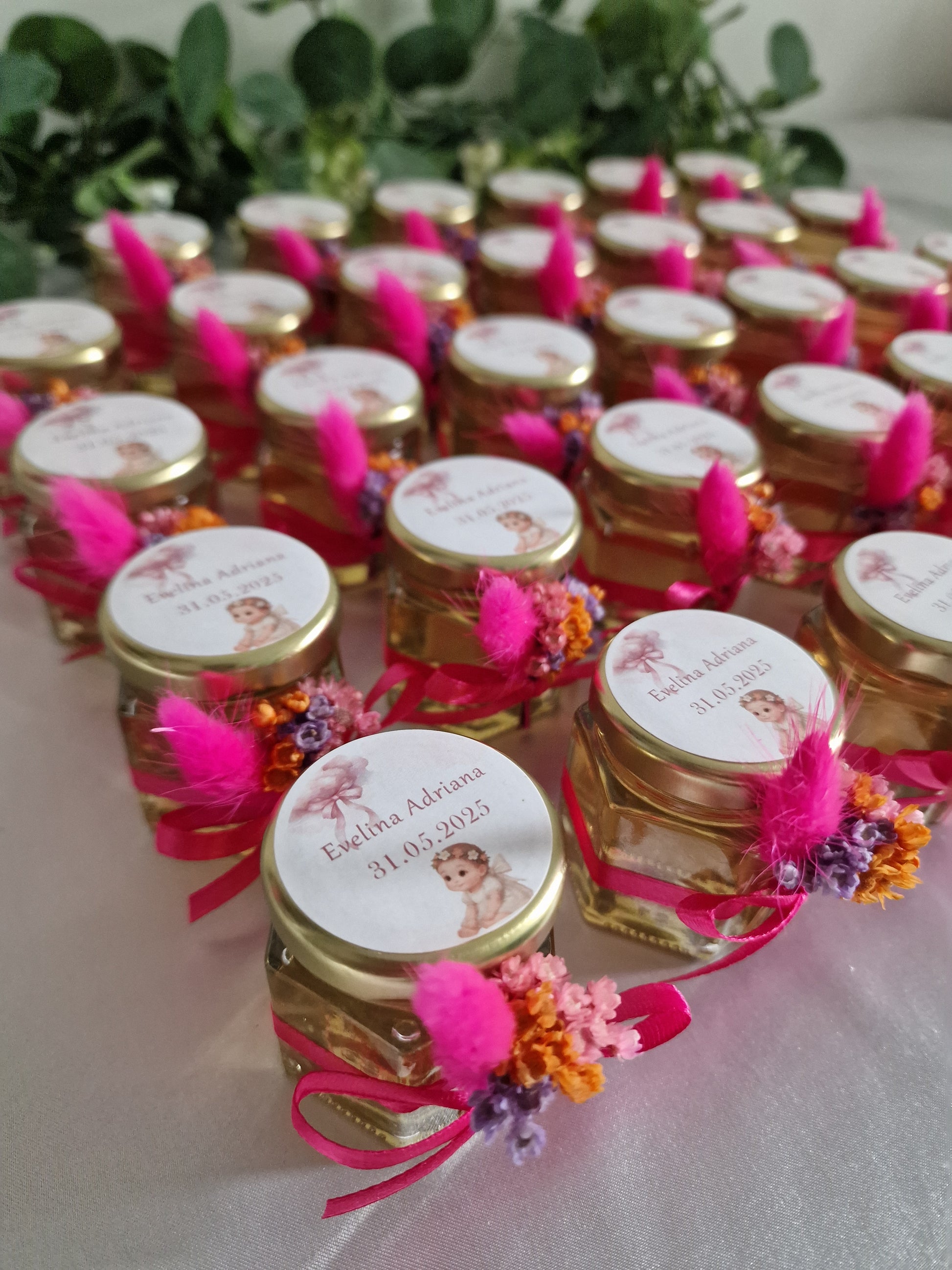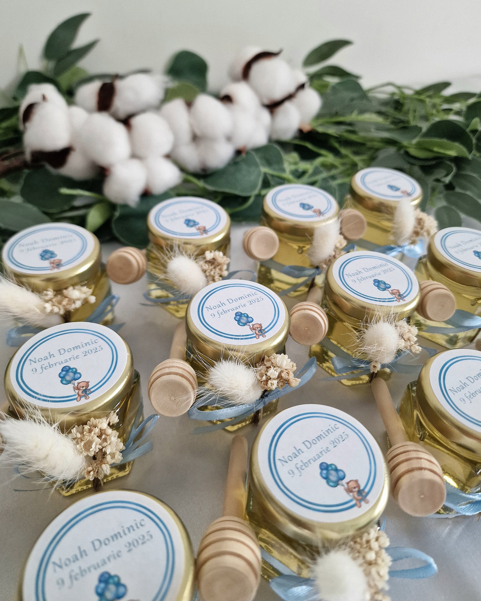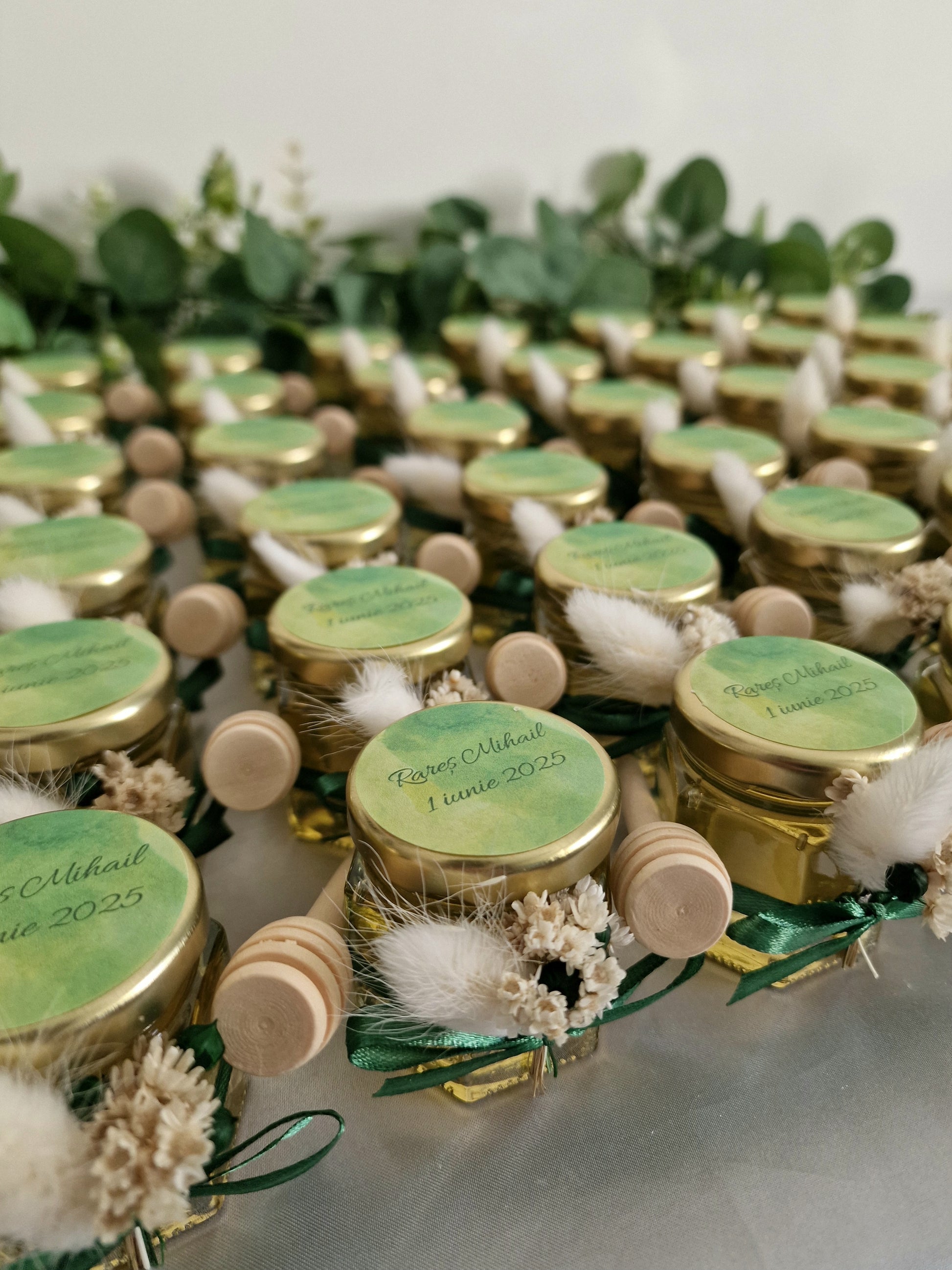 Vă rugăm să specificați finisajele de ambalare preferate (panglici, note de mulțumire, buchețe de flori etc) în rubrica specială de personalizare! După plasarea comenzii, veți fi contactată pentru a discuta în detaliu opțiunile de personalizare ale mărturiilor, astfel încât rezultatul final să reflecte perfect dorințele dumneavoastră.