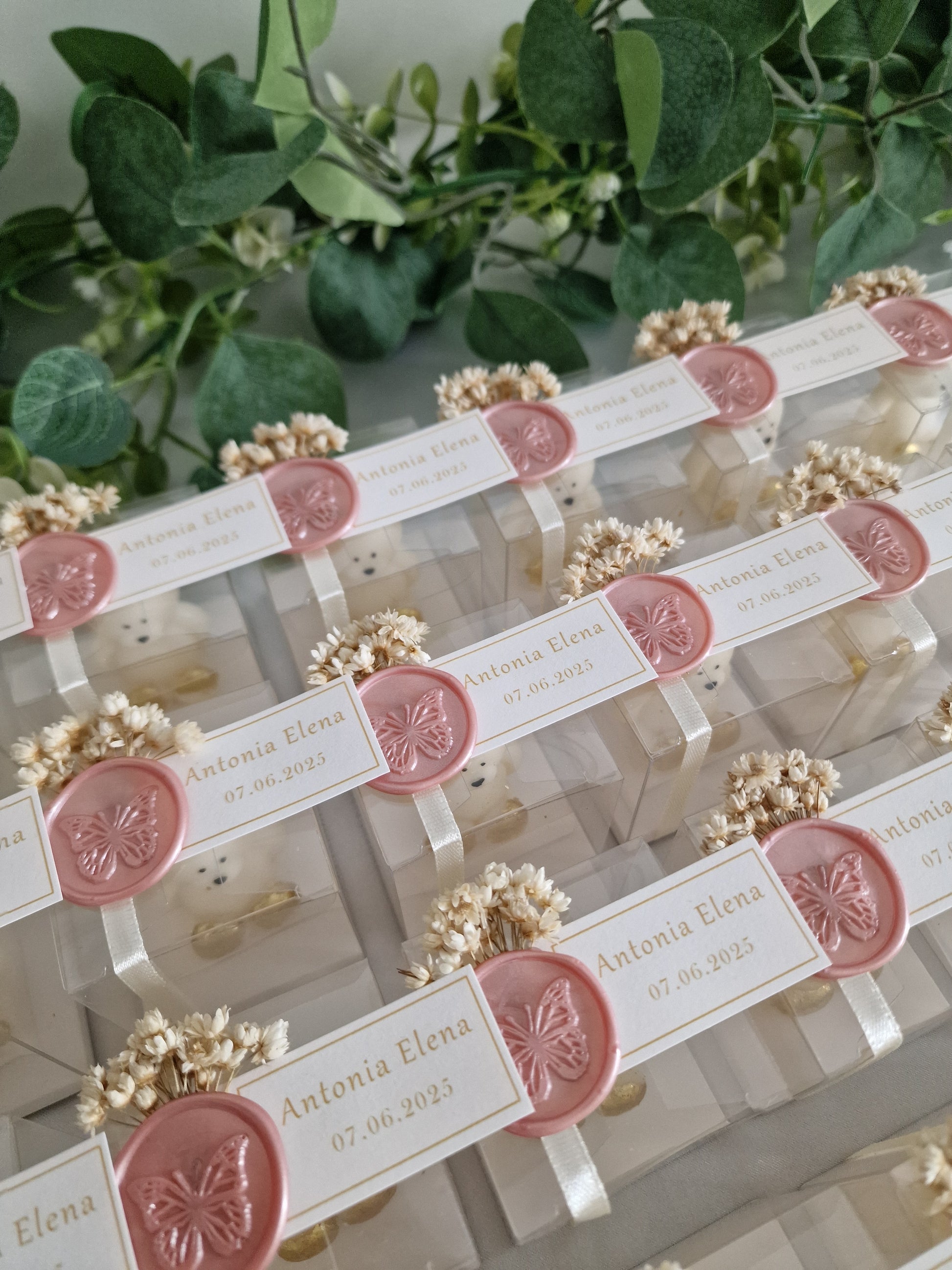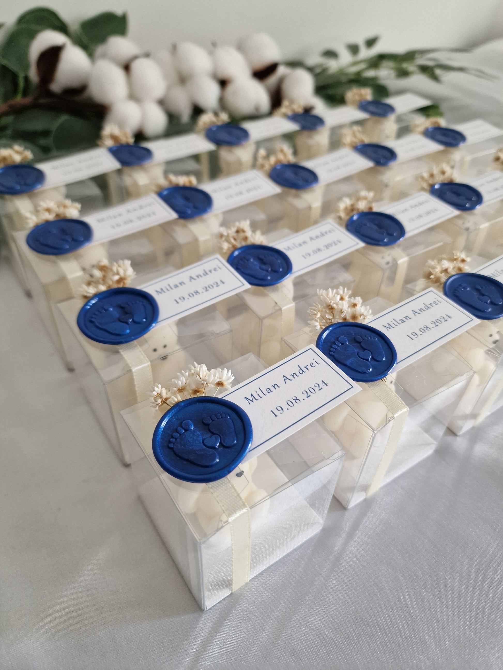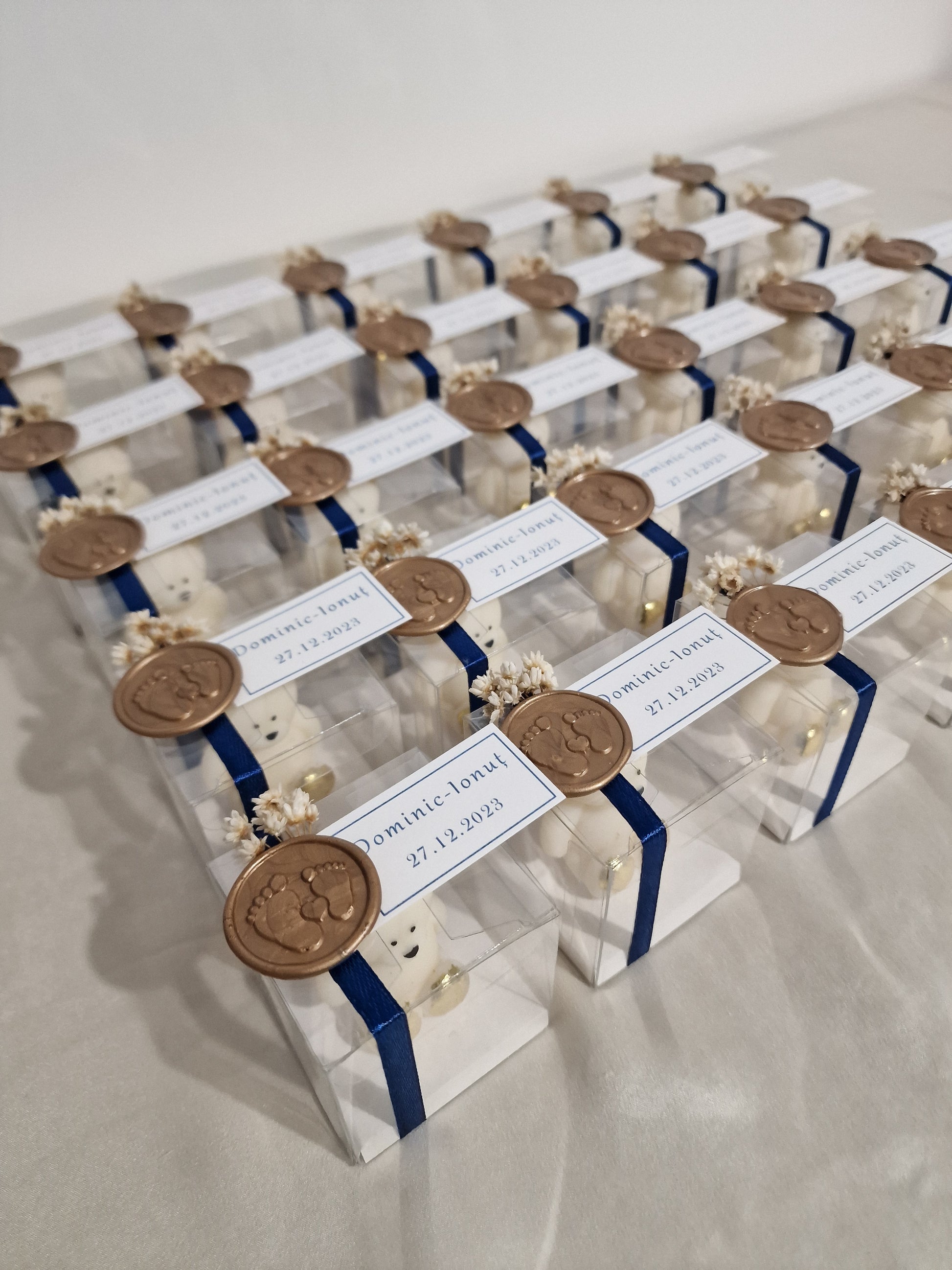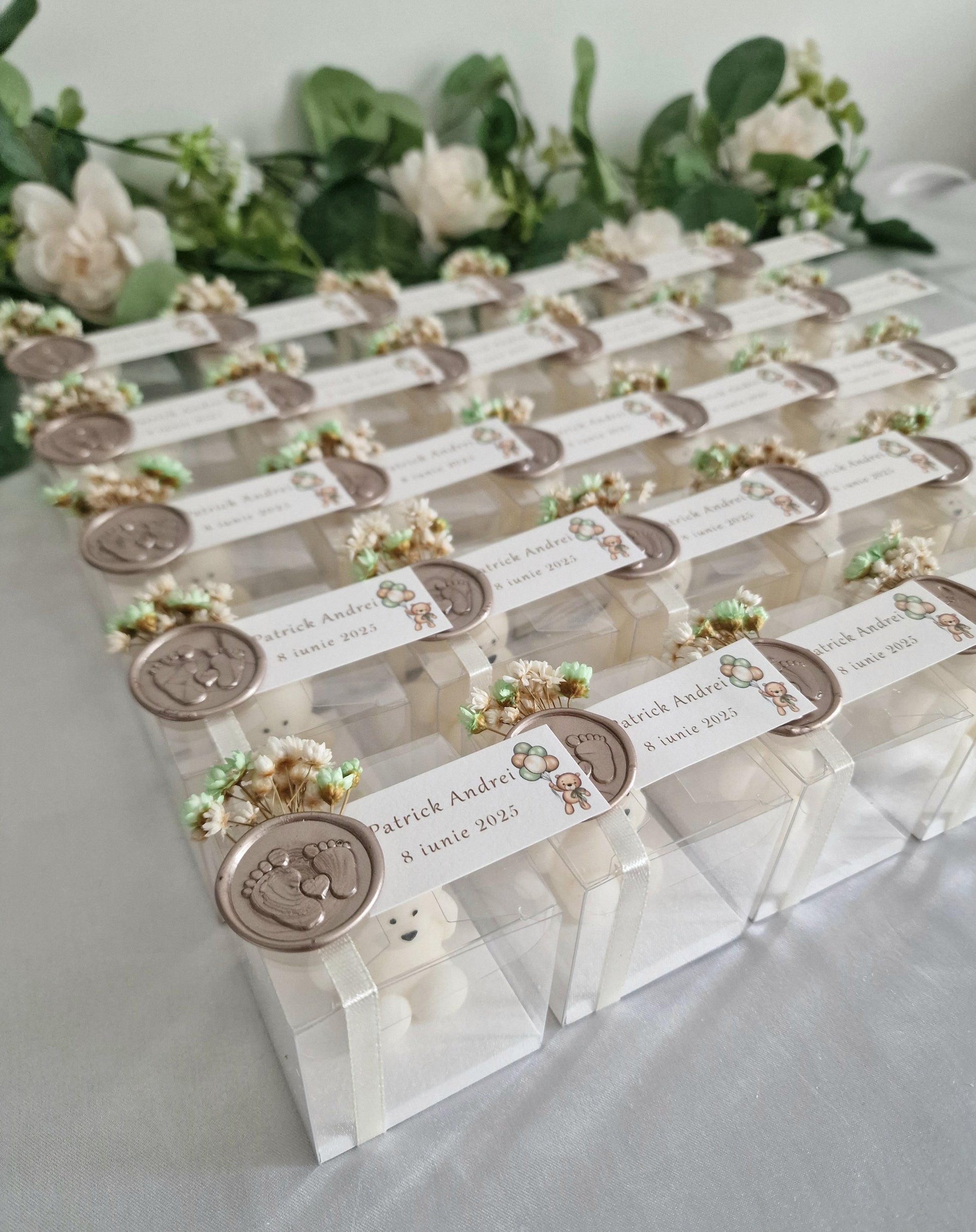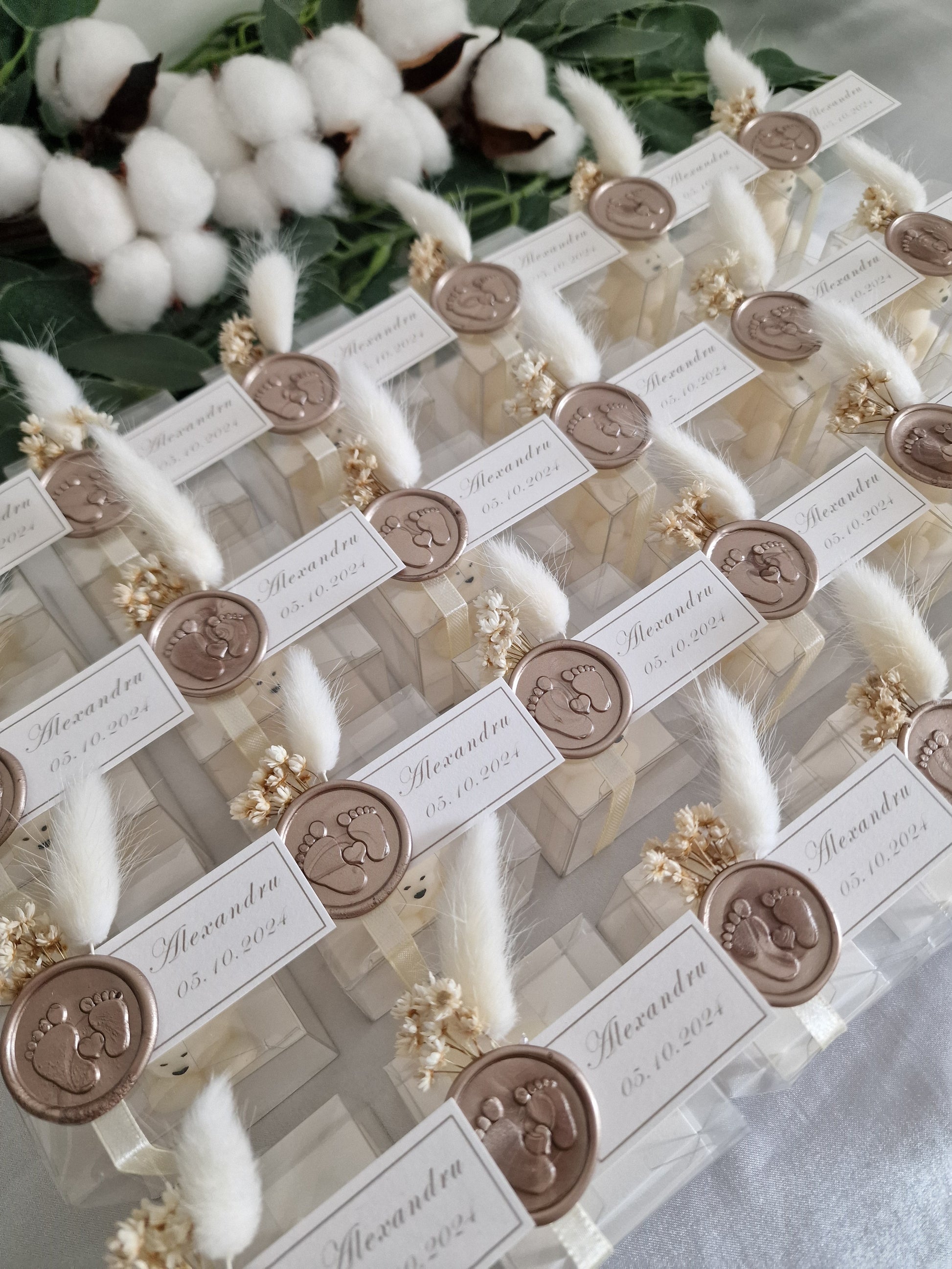 Vă rugăm să specificați finisajele de ambalare preferate (panglici, note de mulțumire, buchețe de flori etc) în rubrica specială de personalizare! După plasarea comenzii, veți fi contactată pentru a discuta în detaliu opțiunile de personalizare ale mărturiilor, astfel încât rezultatul final să reflecte perfect dorințele dumneavoastră.