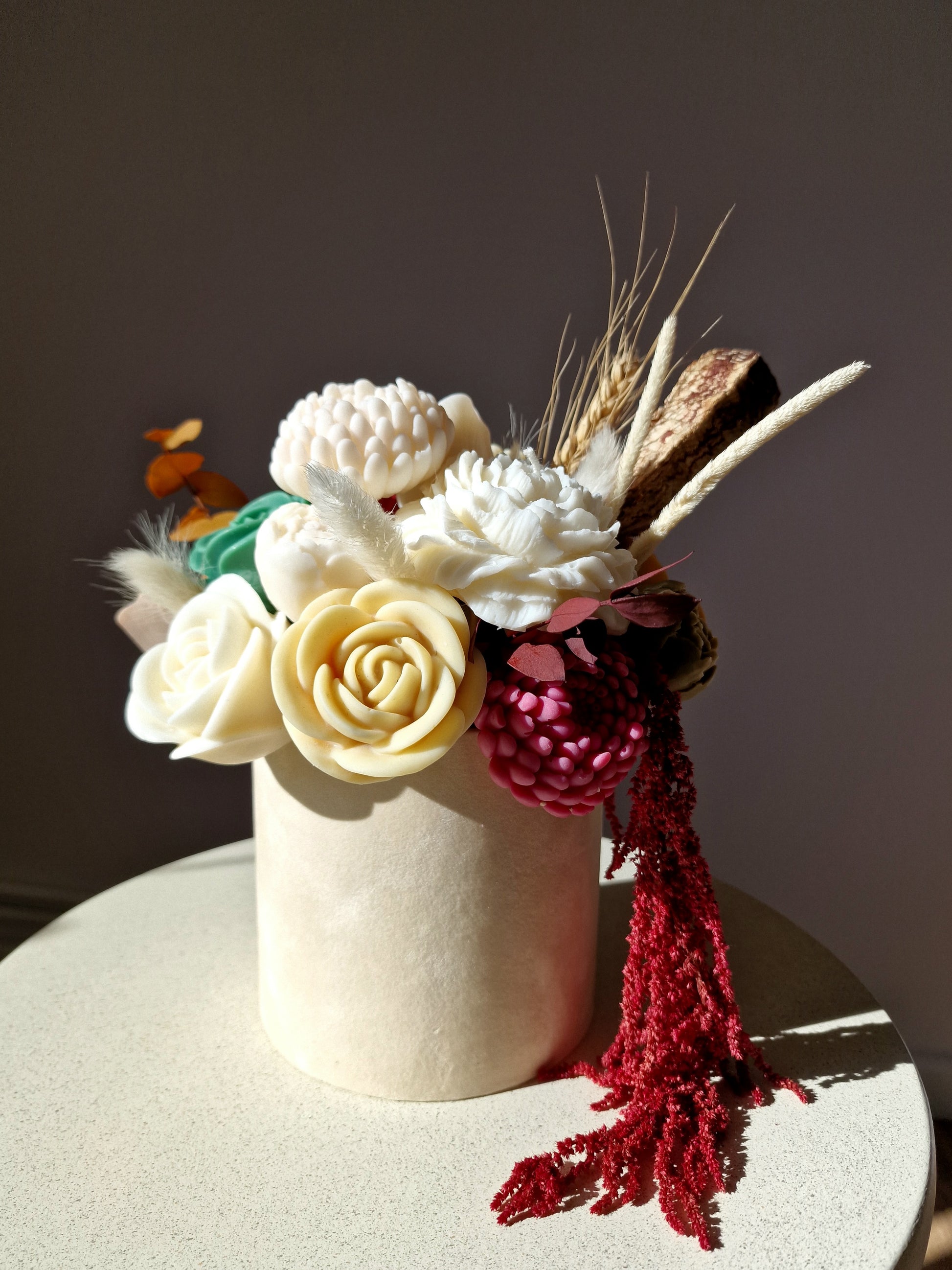 Notele aromatice de toamnă târzie se împletesc cu texturile moi, tonurile pământii și accentele boho, creând aranjamente ce transformă orice spațiu într-un colț de liniște și frumusețe. Toate lumânările noastre sunt fabricate din ceară de soia de cea mai înaltă calitate, asigurându-le durabilitatea și siguranța. Sunt cadoul perfect care va încânta cu siguranță o persoană dragă și va rezista mult timp.
